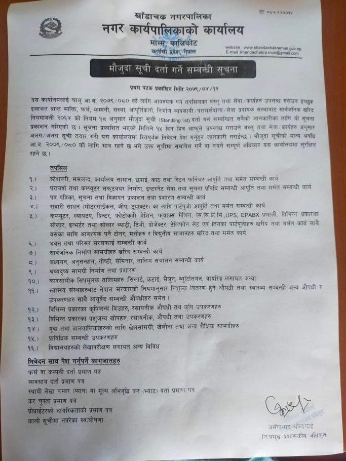 खाँडाचक्र नगरपालिका भित्र रहेका ग्रामिण सडक काे सार्वजनिक बाेलपत्र सूचना